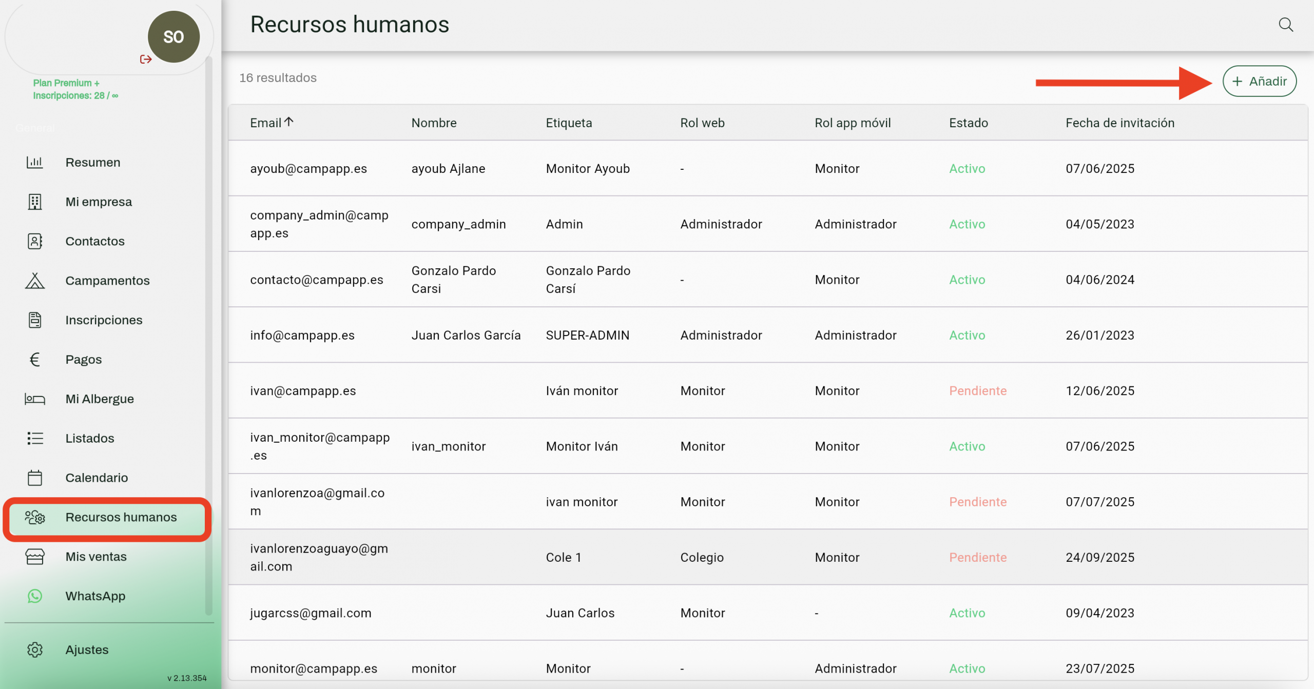 En el menú lateral de tu cuenta de CampApp, ve a Recursos humanos y haz clic en Añadir.