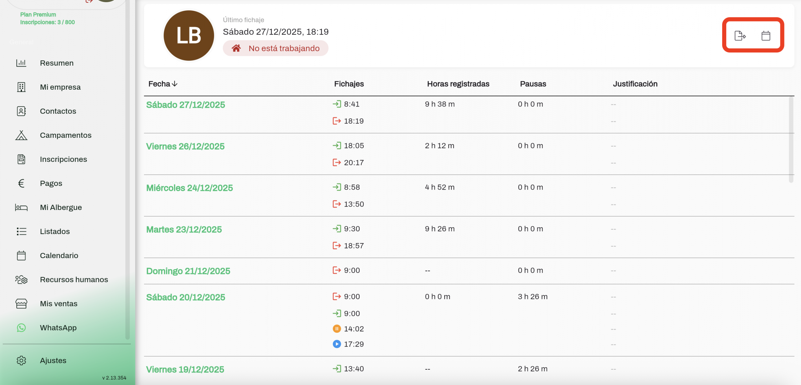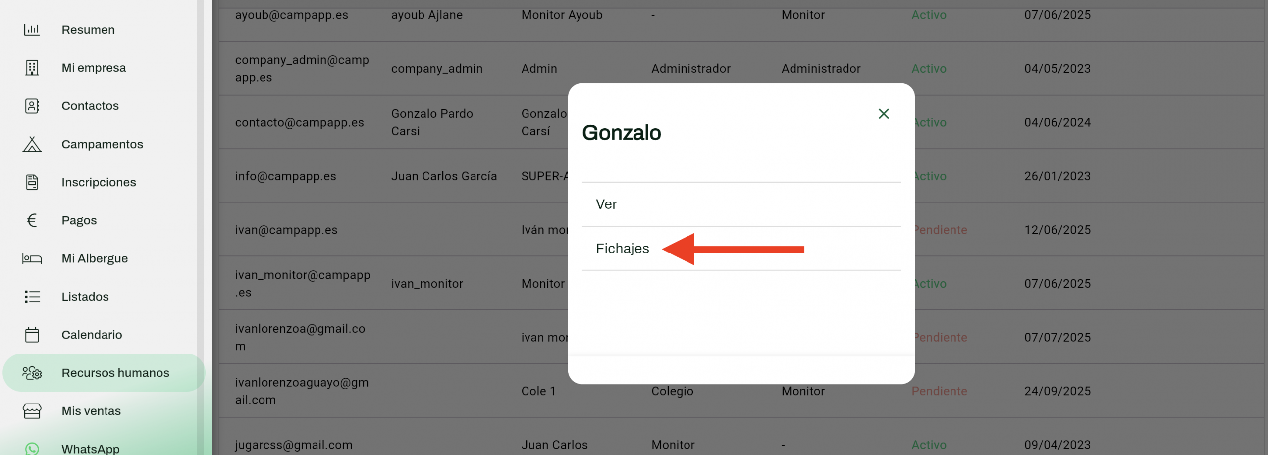 Para poder ver los registros de ese trabajador, solo tienes que volver a tu cuenta de CampApp > Recursos humanos y hacer clic en cualquier parte de la franja del trabajador en cuestión; te aparecerán las opciones Ver y Fichajes.
