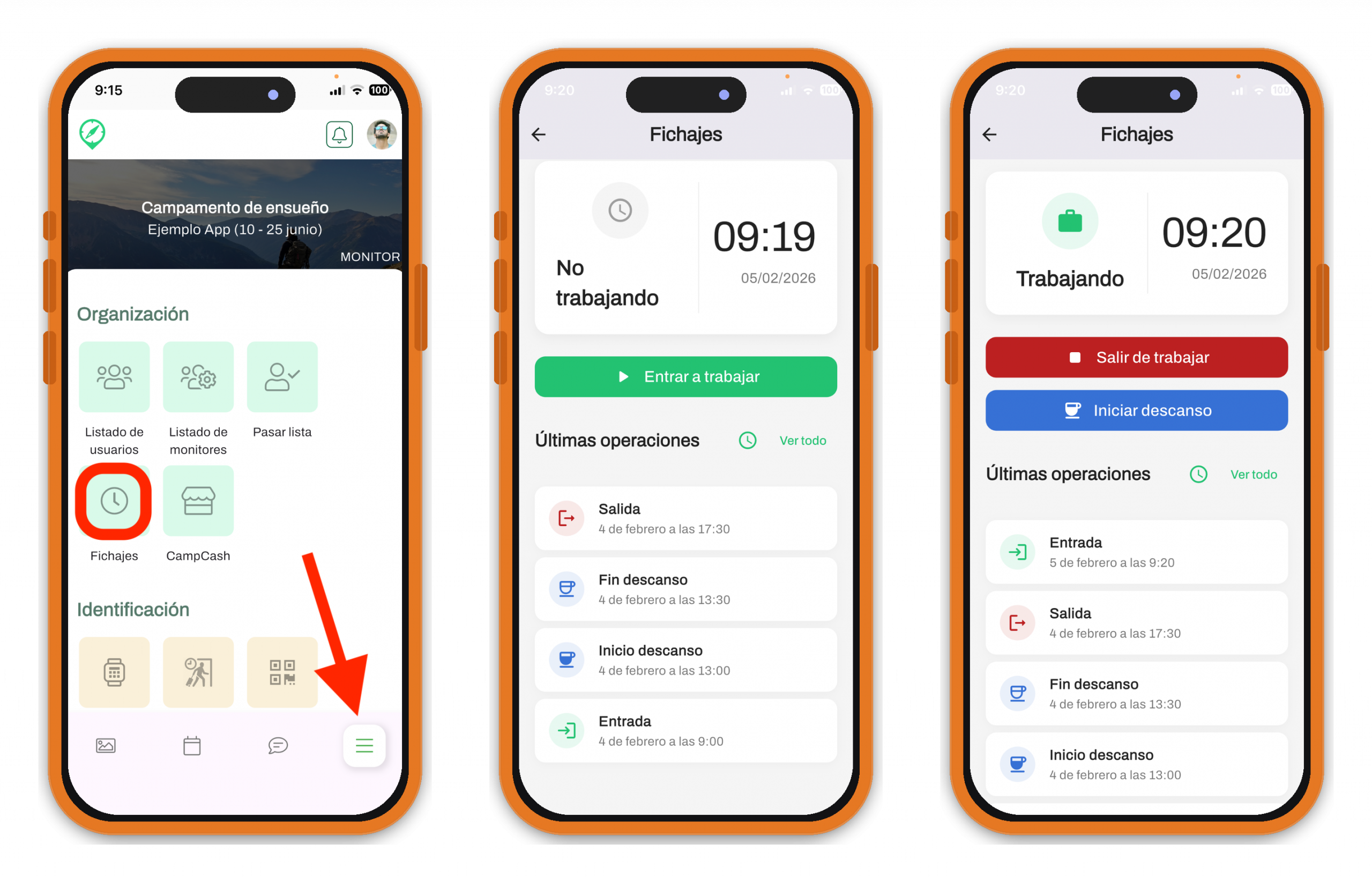 Una vez que el trabajador haya aceptado la invitación, sólo tiene que descargarse la app móvil de CampApp en su teléfono o tablet y, desde ahí, acceder al apartado de Fichajes -que se encuentra en el cuarto icono del menú inferior- para empezar a registrar su jornada y sus descansos.
