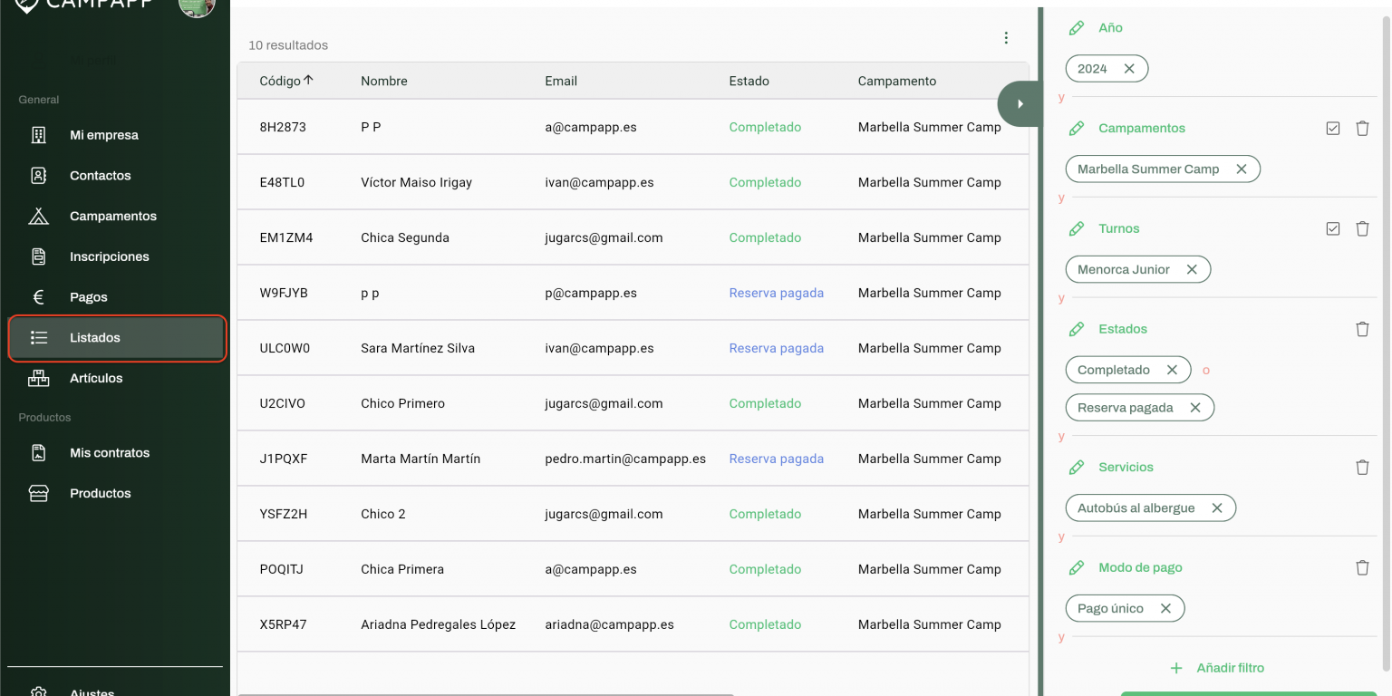 Desde la nueva pantalla de Listados puedes ver todas las inscripciones y aplicar cualquier tipo de filtro: año, campamento, turno, forma de pago, estado, rango de fechas, servicios contratados y cualquier tipo de campo del formulario de inscripción en base a la respuesta.
